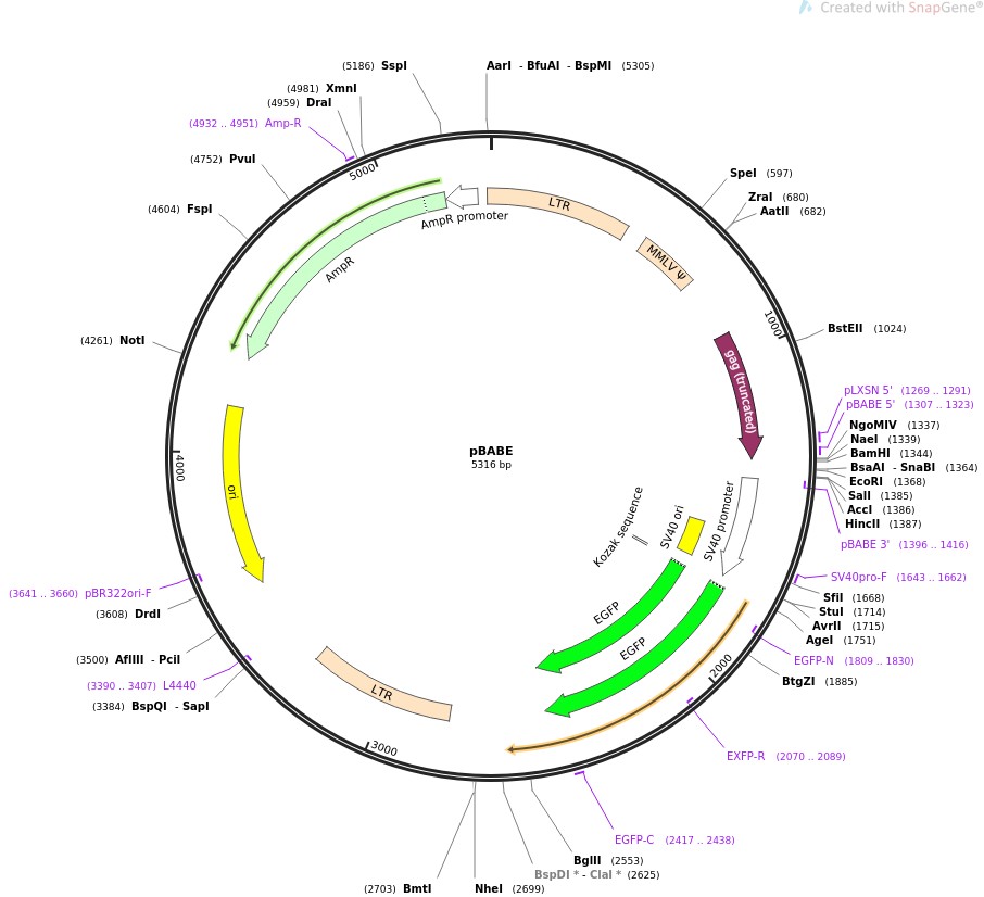 质粒名称:pBABE 质粒编号:21836 载体名称:pBABE-puro 载体大小:4569 载体类型:哺乳动物表达,逆转录 筛选标记:EGFP 原核抗性:氨苄青霉素,100μg/mL 培养温度:37℃ 克隆菌株:DH5alpha 高拷贝/低拷贝:高拷贝 插入基因:EGFP 插入大小:874 克隆方法:限制性内切酶 5'克隆位点:HindIII (destroyed during cloning) 3'克隆位点:ClaI (not destroyed) 5'测序引物:SV40pro-F 质粒图谱: