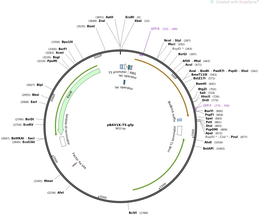 质粒名称:pBAV1K-T5-gfp 质粒编号:26702 载体名称:pBAV1K 载体大小:2792 载体类型:原核表达 原核抗性:卡那霉素,50μg/mL 培养温度:37℃ 克隆菌株:DH5alpha 高拷贝/低拷贝:高拷贝 插入基因:T5lacOlacOeGFP biobrick 物种来源:Synthetic construct 插入大小:861 克隆方法:限制性内切酶 5'克隆位点:EcoRI, XbaI (not destroyed) 3'克隆位点:SpeI, PstI (not destroyed) 5'测序引物:GACGAACTCCAATTCACTGTTCCTTGC 3'测序引物:GGAGAGCGTTCACCGACAAACAACAG 质粒图谱: