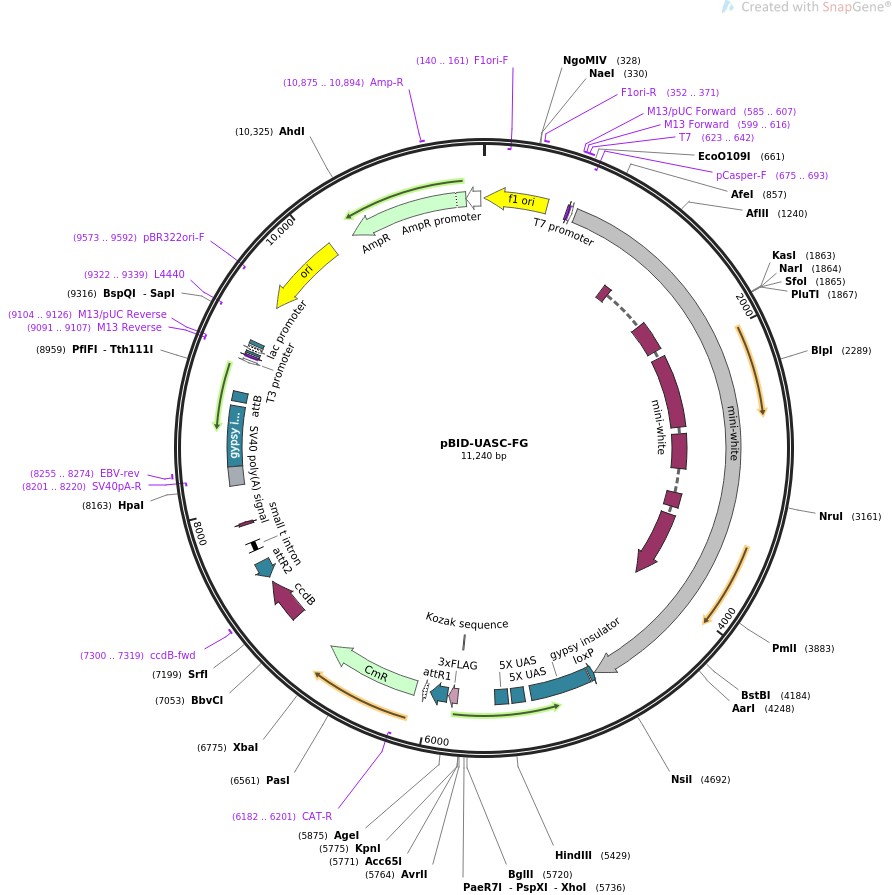 质粒名称:pBID-UASC-FG 质粒编号:35201 质粒备注: (Empty Backbone) 载体名称:pBID-UASC-FG 载体大小:11240 载体类型:Drosophila Transgene Expression 原核抗性:Chloramphenicol and Ampicillin, 25 & 100 μg/mL 培养温度:37℃ 克隆菌株:ccdB Survival 高拷贝/低拷贝:未知 启动子:Drosophila Synthetic Core Promoter (DSCP) 质粒图谱:
