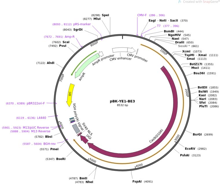 质粒名称:pBK-YE1-BE3 质粒编号:85174 质粒备注: Expresses YE1-BE3 in mammalian cells 载体名称:CMV 载体大小:3399 完整质粒大小:8532 载体类型:哺乳动物表达 原核抗性:氨苄青霉素,100μg/mL 培养温度:37℃ 克隆菌株:DH5alpha 高拷贝/低拷贝:高拷贝 插入基因:YE1-BE3 基因别名:rAPOBEC1(W90Y/R126E)-XTEN-Cas9n-UGI-NLS 物种来源:R. norvegicus (rat); S. pyogenes 插入大小:5133 启动子:CMV 克隆方法:Ligation Independent Cloning 5'测序引物:CMV 3'测序引物:TGGTTCTTTCCGCCTCAGAAGC 质粒图谱: