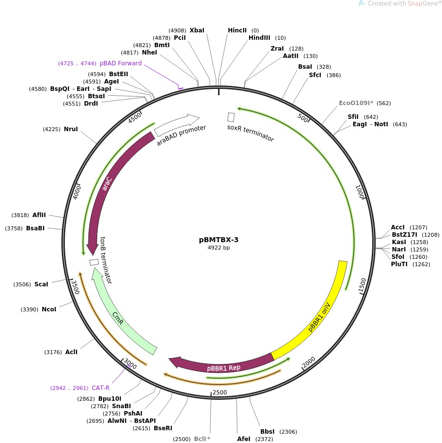 质粒名称:pBMTBX-3 质粒编号:26074 质粒备注: (Empty Backbone) 载体名称:pBMTBX-3 载体大小:4922 载体类型:原核表达 原核抗性:氯霉素25μg/mL 培养温度:37℃ 克隆菌株:DH5alpha 高拷贝/低拷贝:未知 插入基因:None 克隆方法:限制性内切酶 5'克隆位点:NheI (unknown if destroyed) 3'克隆位点:HincII (unknown if destroyed) 5'测序引物:atacccgttt ttttgggcta 质粒图谱: