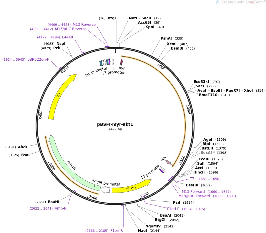 质粒名称:pBSFI-myr-akt1 质粒编号:49186 质粒备注: cDNA of Akt1 with myristyolation signal in cloning vector 载体名称:pBSFI 载体大小:3000 完整质粒大小:4500 载体类型:Adaptor Plasmid 原核抗性:氨苄青霉素,100μg/mL 培养温度:37℃ 克隆菌株:DH5alpha 高拷贝/低拷贝:高拷贝 插入基因:Akt1 基因别名:Akt 物种来源:M. musculus (mouse) 插入大小:1500 基因名称:Akt1 (a.k.a. Akt, LTR-akt, PKB, PKB/Akt, PKBalpha, Rac) 启动子:T7 标签/融合蛋白:· myristolation signal (N terminal on insert) · HA tag (C terminal on insert) 克隆方法:限制性内切酶 5'克隆位点:BamHI (destroyed during cloning) 3'克隆位点:EcoRI (not destroyed) 5'测序引物:T3 3'测序引物:T7 质粒图谱: