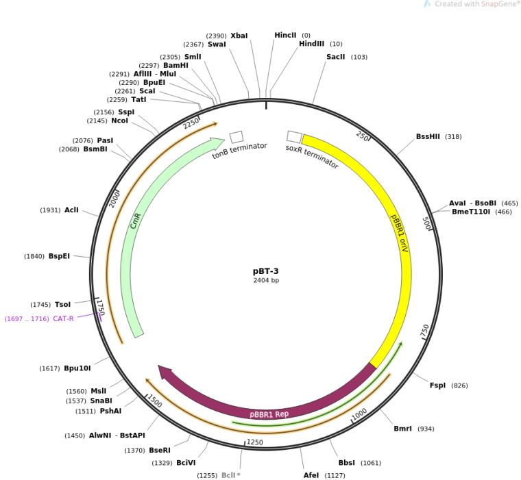 质粒名称:pBT-3 质粒编号:22832 质粒备注: (Empty Backbone) 载体名称:pBT-3 载体大小:2404 载体类型:原核表达 原核抗性:氯霉素25μg/mL 培养温度:37℃ 克隆菌株:DH5alpha 高拷贝/低拷贝:未知 插入基因:None 克隆方法:限制性内切酶 5'克隆位点:XbaI (unknown if destroyed) 3'克隆位点:EcoRV (unknown if destroyed) 5'测序引物:tggtcagtat tgagcgatat 质粒图谱: