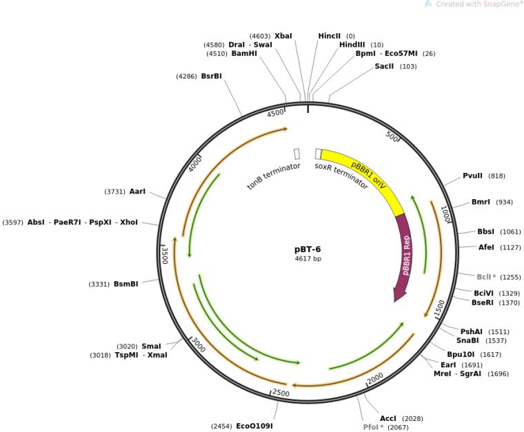 质粒名称:pBT-6 质粒编号:22829 质粒备注: (Empty Backbone) 载体名称:pBT-6 载体大小:4617 载体类型:原核表达 原核抗性:Tellurite 培养温度:37℃ 克隆菌株:DH5alpha 高拷贝/低拷贝:未知 插入基因:None 克隆方法:限制性内切酶 5'克隆位点:XbaI (unknown if destroyed) 3'克隆位点:EcoRV (unknown if destroyed) 5'测序引物:aaatggtcag tattgagcga 质粒图谱: