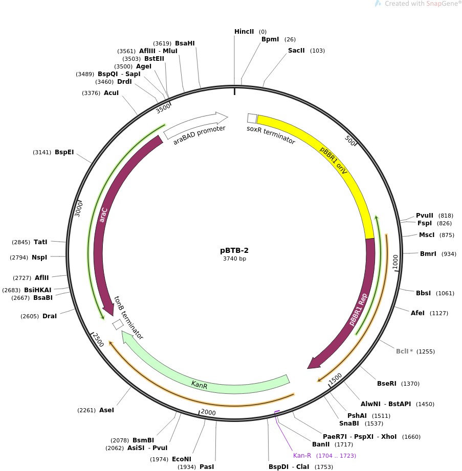 质粒名称:pBTB-2 质粒编号:22818 质粒备注: (Empty Backbone) 载体名称:pBTB-2 载体大小:3740 载体类型:原核表达 原核抗性:卡那霉素,50μg/mL 培养温度:37℃ 克隆菌株:DH5alpha 高拷贝/低拷贝:未知 插入基因:None 克隆方法:限制性内切酶 5'克隆位点:XbaI (unknown if destroyed) 3'克隆位点:EcoRV (unknown if destroyed) 5'测序引物:tgtttctccatacccgtttt 质粒图谱: