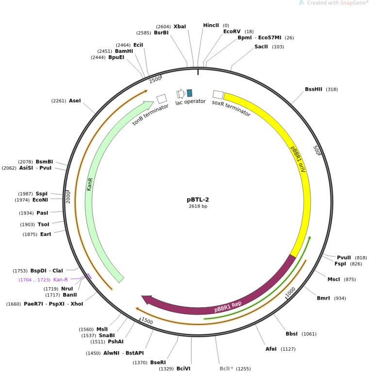 质粒名称:pBTL-2 质粒编号:22806 载体名称:pBTL-2 载体大小:2618 载体类型:原核表达 原核抗性:卡那霉素,50μg/mL 培养温度:37℃ 克隆菌株:DH5alpha 高拷贝/低拷贝:未知 插入基因:None 插入大小:3847 克隆方法:限制性内切酶 5'克隆位点:XbaI (unknown if destroyed) 3'克隆位点:EcoRV (unknown if destroyed) 5'测序引物:gtgagcggataacaatttca 质粒图谱:
