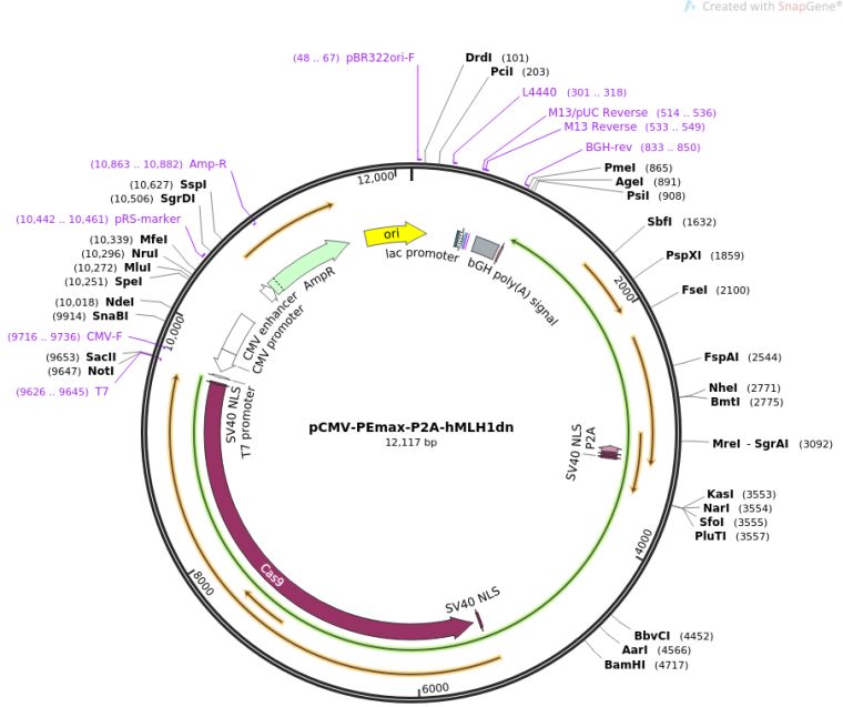 质粒名称:pCMV-PEmax-P2A-hMLH1dn 质粒编号:174828 质粒备注: Mammalian expression of SpCas9 PEmax prime editor with P2A-human MLH1dn (codon optimized) 载体名称:pCMV 载体类型:哺乳动物表达 原核抗性:氨苄青霉素,100μg/mL 培养温度:37℃ 克隆菌株:NEB Stable 高拷贝/低拷贝:高拷贝 插入基因:PEmax-P2A-hMLH1dn 基因别名:SV40_bpNLS-SpCas9(R221K,N394K,H840A)-SGGSx2-SV40_bpNLS-SGGSx2-MMLV_RT(D200N, T306K, W313F, T330P, L603W)-SV40_bpNLS-cMyc_NLS 基因别名:homo sapiens MLH1 del754-756 (codon optimized) 物种来源:H. sapiens (human), Synthetic; SpCas9 is from Streptococcus pyogenes; MMLV_RT is from the Moloney murine leukemia virus 基因突变:Detailed in manuscript; deletion of residues 754-756 in MLH1 插入大小:8715 启动子:CMV 标签/融合蛋白:· SV40 bpNLS (N terminal on insert) · SV40 bpNLS (C terminal on insert) · c-Myc NLS (C terminal on insert) 克隆方法:Ligation Independent Cloning 5'测序引物:T7-forward 3'测序引物:BGH-reverse 质粒图谱: