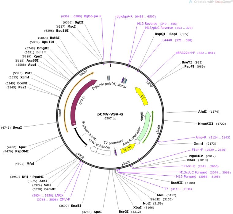 质粒名称:pCMV-VSV-G 质粒编号:8454 质粒备注: (Empty Backbone) Envelope protein for producing lentiviral and MuLV retroviral particles. Use in conjunction with a packaging vector such as pCMV-dR8.2 dvpr (lentiviral) or pUMVC (MuLV retroviral). 载体名称:na 载体大小:6363 载体类型:哺乳动物表达 原核抗性:氨苄青霉素,100μg/mL 培养温度:37℃ 克隆菌株:DH5alpha 高拷贝/低拷贝:高拷贝 插入基因:None 克隆方法:限制性内切酶 5'测序引物:T7 质粒图谱: