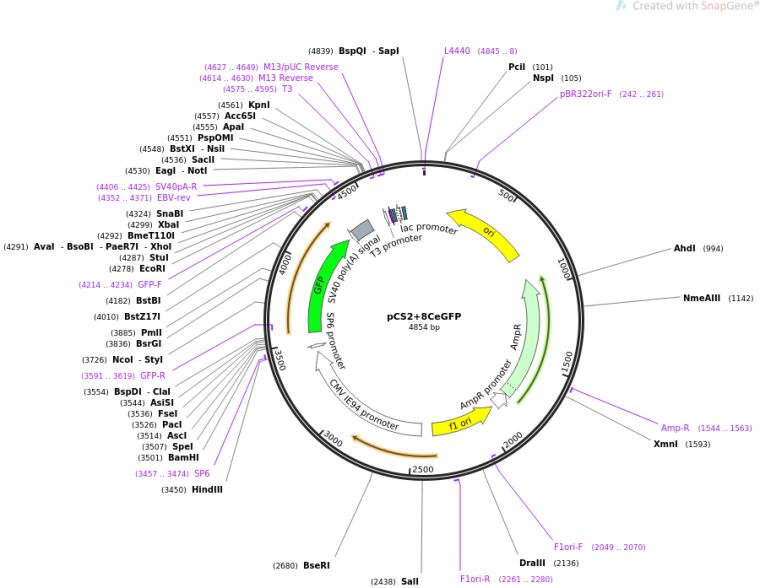 质粒名称:pCS2+8CeGFP 质粒编号:34952 质粒备注: (Empty Backbone) 载体名称:pCS2+ 载体大小:4095 载体类型:Mammalian Expression ; Sea urchin, zebrafish, Xenopus 原核抗性:氨苄青霉素,100μg/mL 培养温度:37℃ 克隆菌株:DH10B 高拷贝/低拷贝:高拷贝 启动子:SP6 质粒图谱: