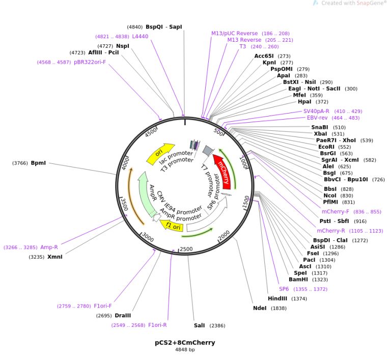质粒名称:pCS2+8CmCherry 质粒编号:34935 质粒备注: (Empty Backbone) 载体名称:pCS2+ 载体大小:4095 载体类型:Mammalian Expression ; Sea urchin, zebrafish, Xenopus 原核抗性:氨苄青霉素,100μg/mL 培养温度:37℃ 克隆菌株:DH10B 高拷贝/低拷贝:高拷贝 启动子:SP6 质粒图谱: