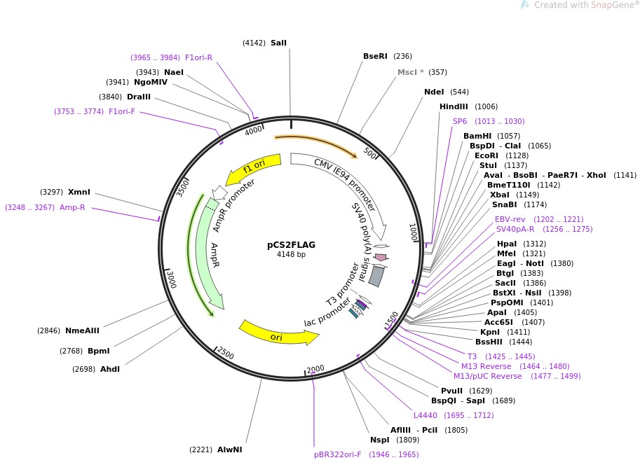 质粒名称:pCS2FLAG 质粒编号:16331 载体名称:pCS2+ 载体大小:4095 载体类型:Vertebrate expression 原核抗性:氨苄青霉素,100μg/mL 培养温度:37℃ 克隆菌株:DH5alpha 高拷贝/低拷贝:高拷贝 插入基因:Flag tag 基因别名:pCS2+Flag 基因突变:Flag tag inserted into pCS2+ polylinker 插入大小:63 克隆方法:限制性内切酶 5'克隆位点:claI (not destroyed) 3'克隆位点:EcoRI (not destroyed) 5'测序引物:SP6 3'测序引物:T3 质粒图谱: