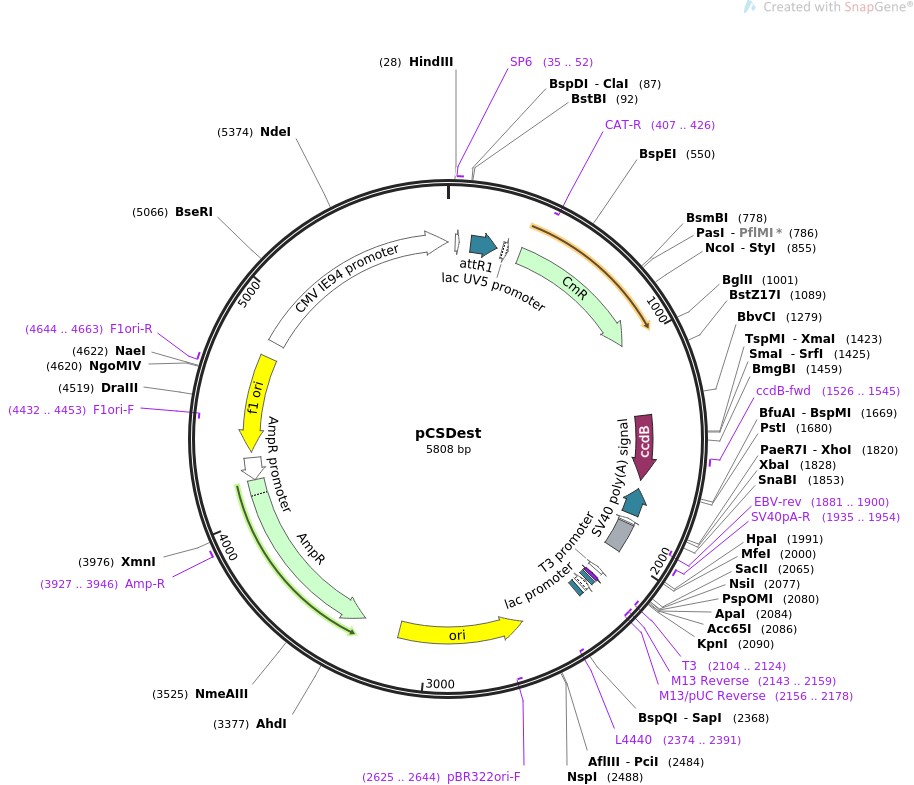 质粒名称:pCSDest 质粒编号:22423 质粒备注: (Empty Backbone) 载体名称:pCS2+ 载体大小:5808 原核抗性:Chloramphenicol and Ampicillin, 25 & 100 μg/mL 培养温度:37℃ 克隆菌株:ccdB Survival 高拷贝/低拷贝:未知 插入基因:None 克隆方法:限制性内切酶 5'克隆位点:StuI (unknown if destroyed) 3'克隆位点:StuI (unknown if destroyed) 5'测序引物:CMV-F, SP6 3'测序引物:T3 质粒图谱:
