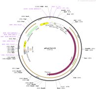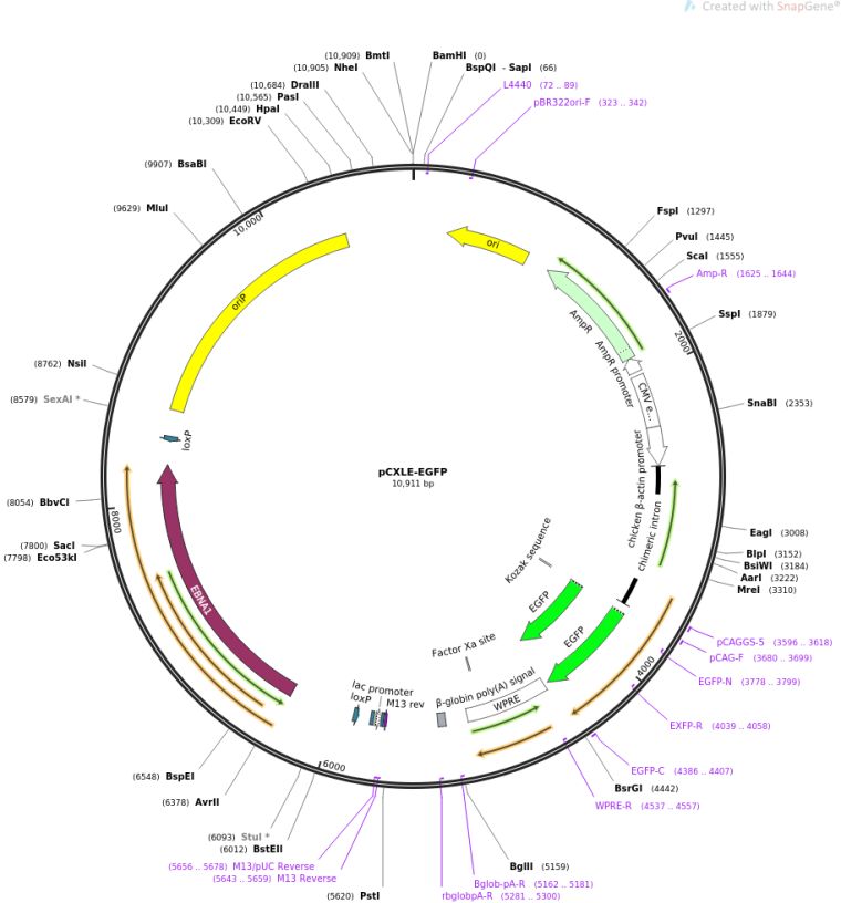 质粒名称:pCXLE-EGFP 质粒编号:27082 质粒备注: Integration-free (episomal) expression of EGFP 载体名称:pCXLE 载体大小:10180 载体类型:哺乳动物表达 原核抗性:氨苄青霉素,100μg/mL 培养温度:37℃ 克隆菌株:DH5alpha 高拷贝/低拷贝:高拷贝 插入基因:eGFP 插入大小:732 克隆方法:限制性内切酶 5'克隆位点:EcoRI (not destroyed) 3'克隆位点:EcoRI (not destroyed) 5'测序引物:pCAG-F 3'测序引物:WPRE-R 质粒图谱: