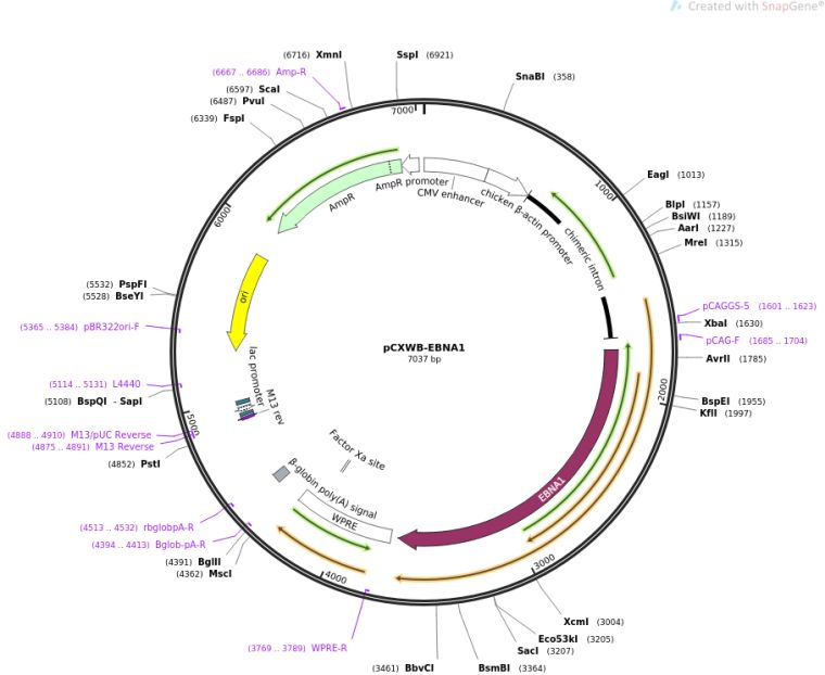 质粒名称:pCXWB-EBNA1 质粒编号:37624 质粒备注: Non-replicating episomal expression of EBNA1, which enhances transfection efficiency and expression from episomal plasmids 载体名称:pCXWB 载体大小:5078 载体类型:哺乳动物表达 原核抗性:氨苄青霉素,100μg/mL 培养温度:37℃ 克隆菌株:DH5alpha 高拷贝/低拷贝:高拷贝 插入基因:EBNA-1 基因别名:HHV4-EBNA-1.1 物种来源:human herpesvirus 4 插入大小:1926 基因名称:EBNA-1 (a.k.a. HHV4_EBNA-1.1) 启动子:CAG 克隆方法:限制性内切酶 5'克隆位点:EcoRI (not destroyed) 3'克隆位点:EcoRI (not destroyed) 5'测序引物:pCAG-F 3'测序引物:WPRE-R 质粒图谱: