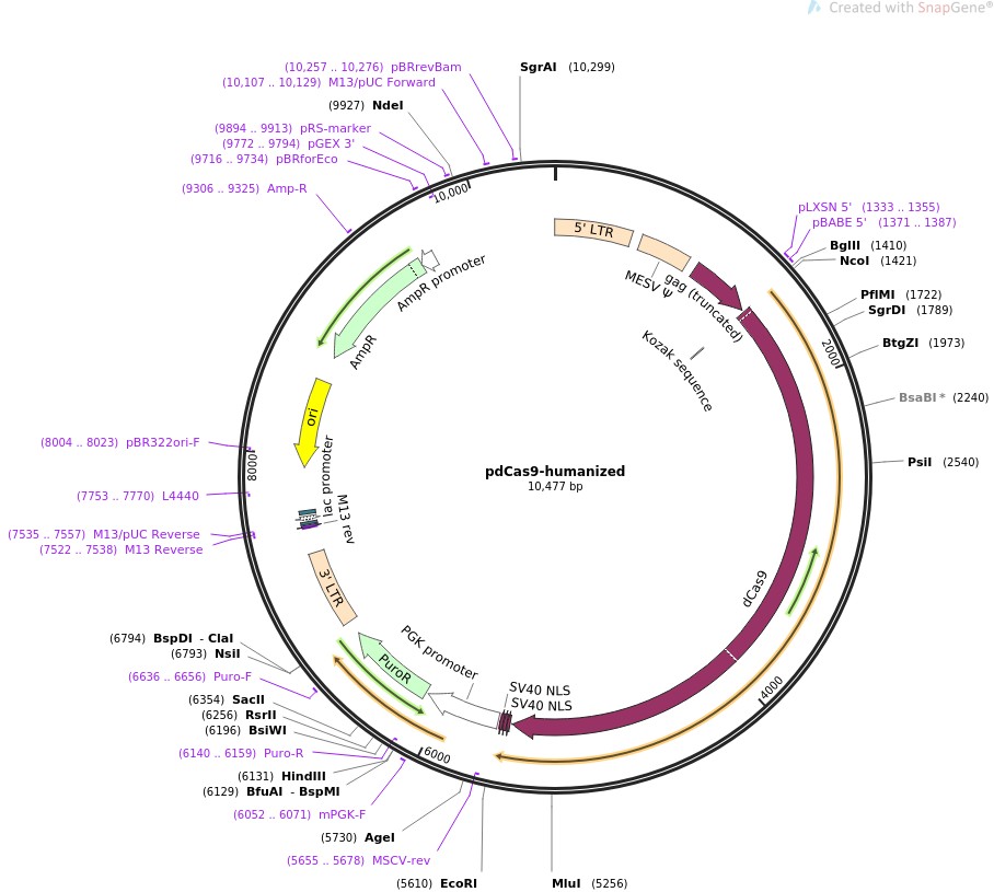 质粒名称:pdCas9-humanized 质粒编号:44246 质粒备注: Expression of a catalytically inactive, human codon-optimized Cas9 under the control of Murine Stem Cell retroVirus LTR promoter for mammalian gene knockdown 载体名称:pMSCVpuro 完整质粒大小:10477 载体类型:Mammalian Expression, Retroviral, CRISPR ; vector 筛选标记:嘌呤霉素 原核抗性:氨苄青霉素,100μg/mL 培养温度:37℃ 克隆菌株:DH5alpha 高拷贝/低拷贝:高拷贝 插入基因:dead Cas9 with 3X NLS 基因别名:Catalytically inactive Cas9 物种来源:H. sapiens (human) 基因突变:D10A H840A (catalytically inactive) 插入大小:4188 启动子:MSCV LTR promoter 克隆方法:未知 5'测序引物:CCGGAATTAGATCTCGCCACCATGGAC 3'测序引物:CCGGTAGAATTCTATACCTTTCTCTTCT 质粒图谱: