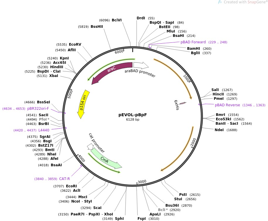 质粒名称:pEVOL-pBpF 质粒编号:31190 质粒备注: tRNA synthetase/tRNA pair for the in vivo incorporation of a photocrosslinker, p-benzoyl-l-phenylalanine into proteins in E coli in response to the amber codon, TAG. 载体名称:p15A 载体大小:5000 载体类型:原核表达 原核抗性:氯霉素25μg/mL 培养温度:37℃ 克隆菌株:DH5alpha 高拷贝/低拷贝:高拷贝 插入基因:M.j. p-benzoylphenylalanine RS (2 copies +tRNA) 基因别名:pEVOL-pBpF 物种来源:M.jannaschii 基因突变:Y32G, E107P, D158T, I159S 插入大小:1000 克隆方法:限制性内切酶 5'克隆位点:BglII (not destroyed) 3'克隆位点:SalI (not destroyed) 5'测序引物:ATTAGCGGATCCTACCTGACGCTTTTTATCGCAACTCTCTACTGTTTCTCCATACCCGTTTTTT 质粒图谱:
