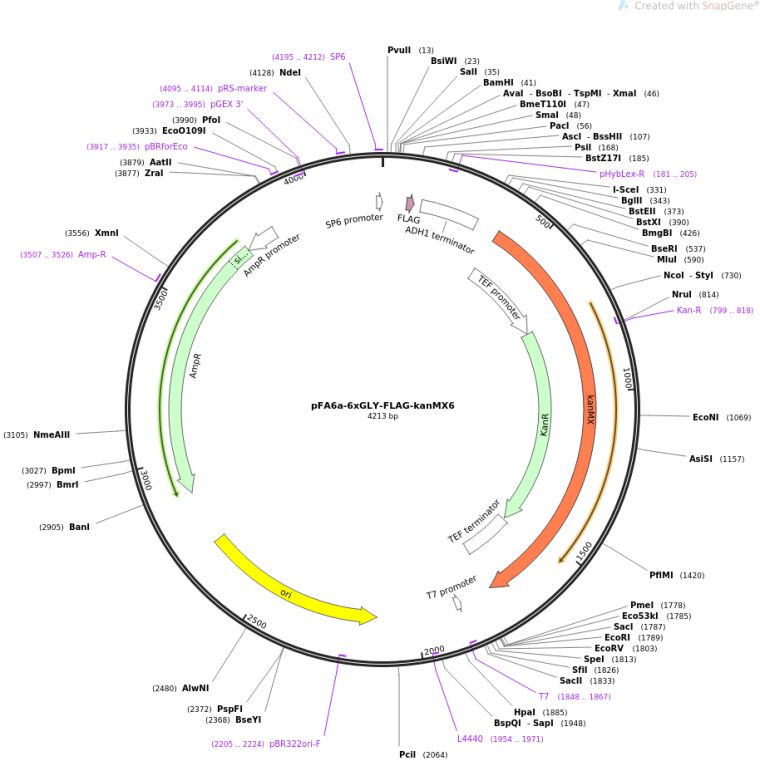 质粒名称:pFA6a-6xGLY-FLAG-kanMX6 质粒编号:20751 质粒备注: (Empty Backbone) 载体名称:pFA6a 载体大小:2513 载体类型:PCR-based C-terminal tagging 筛选标记:G418 原核抗性:氨苄青霉素,100μg/mL 培养温度:37℃ 克隆菌株:DH5alpha 高拷贝/低拷贝:未知 插入基因:None 克隆方法:限制性内切酶 5'克隆位点:PacI (unknown if destroyed) 3'克隆位点:PmeI (unknown if destroyed) 5'测序引物:SP6 3'测序引物:T7 质粒图谱: