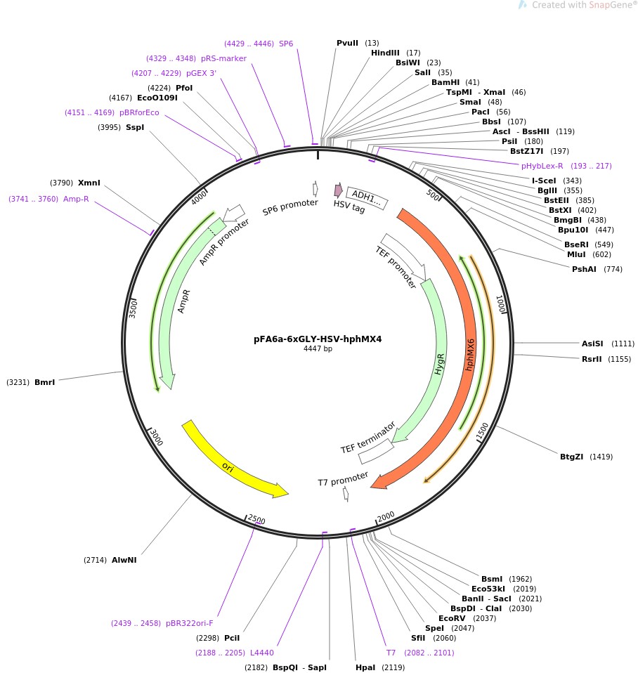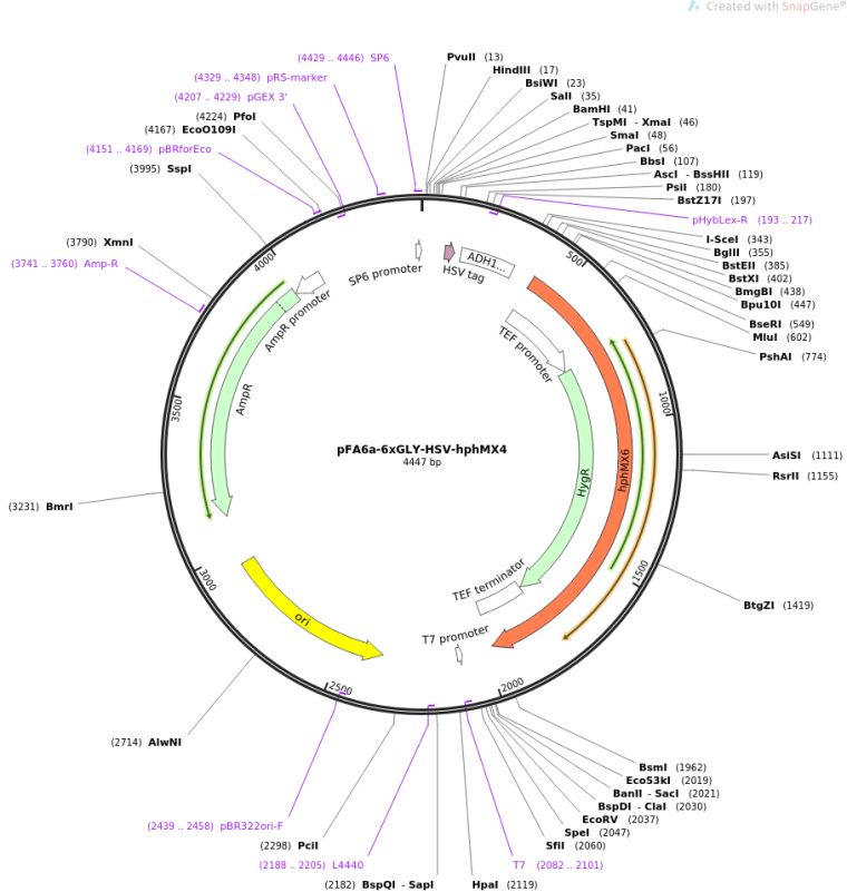 质粒名称:pFA6a-6xGLY-HSV-hphMX4 质粒编号:20776 质粒备注: (Empty Backbone) 载体名称:pFA6a 载体大小:2513 载体类型:PCR-based C-terminal tagging 筛选标记:潮霉素 原核抗性:氨苄青霉素,100μg/mL 培养温度:37℃ 克隆菌株:DH5alpha 高拷贝/低拷贝:未知 插入基因:None 克隆方法:限制性内切酶 5'克隆位点:PacI (unknown if destroyed) 3'克隆位点:PmeI (unknown if destroyed) 5'测序引物:SP6 3'测序引物:T7 质粒图谱: