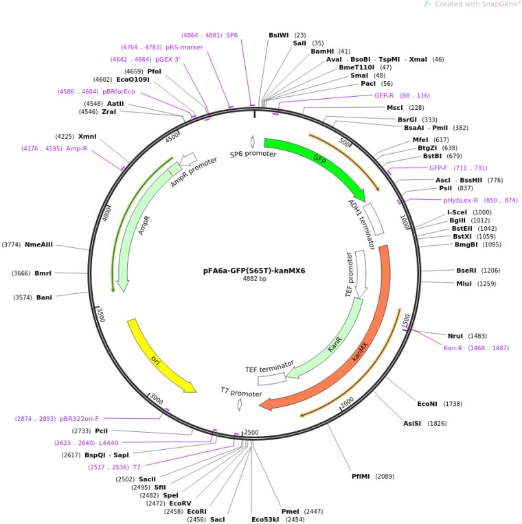 质粒名称:pFA6a-GFP(S65T)-kanMX6 质粒编号:39292 载体名称:pFA6a 载体大小:2300 载体类型:Yeast genomic targeting 筛选标记:Gentamicin 原核抗性:氨苄青霉素,100μg/mL 培养温度:37℃ 克隆菌株:DH5alpha 高拷贝/低拷贝:未知 插入基因:KanR 基因别名:kanamycin resistance cassette 插入大小:2500 标签/融合蛋白:· GFP (S65T) (N terminal on insert) · yeast ADH1 terminator (N terminal on insert) · A. gossypii translation elongation factor 1a gene promoter (N terminal on insert) · A. gossypii translation elongation factor 1a gene terminator (C terminal on insert) 克隆方法:限制性内切酶 5'克隆位点:PacI (not destroyed) 3'克隆位点:PmeI (not destroyed) 5'测序引物:Sp6_primer 3'测序引物:T7_promoter 质粒图谱: