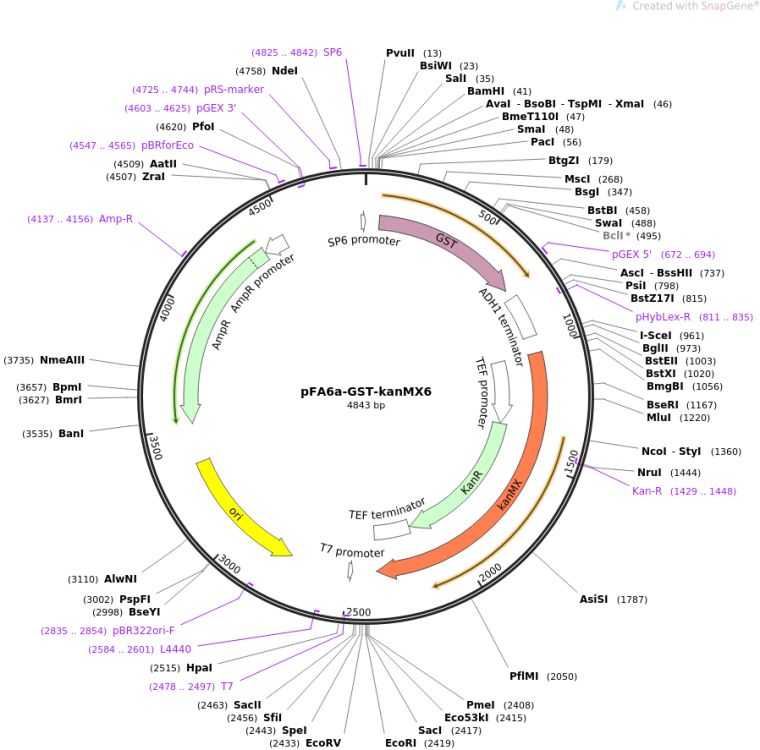 质粒名称:pFA6a-GST-kanMX6 质粒编号:39293 载体名称:pFA6a 载体大小:2300 载体类型:Yeast genomic targeting 筛选标记:Gentamicin 原核抗性:氨苄青霉素,100μg/mL 培养温度:37℃ 克隆菌株:DH5alpha 高拷贝/低拷贝:未知 插入基因:KanR 基因别名:kanamycin resistance cassette 插入大小:2500 标签/融合蛋白:· GST (N terminal on insert) · yeast ADH1 terminator (N terminal on insert) · A. gossypii translation elongation factor 1a gene promoter (N terminal on insert) · A. gossypii translation elongation factor 1a gene terminator (C terminal on insert) 克隆方法:限制性内切酶 5'克隆位点:PacI (not destroyed) 3'克隆位点:PmeI (not destroyed) 5'测序引物:Sp6_primer 3'测序引物:T7_promoter 质粒图谱: