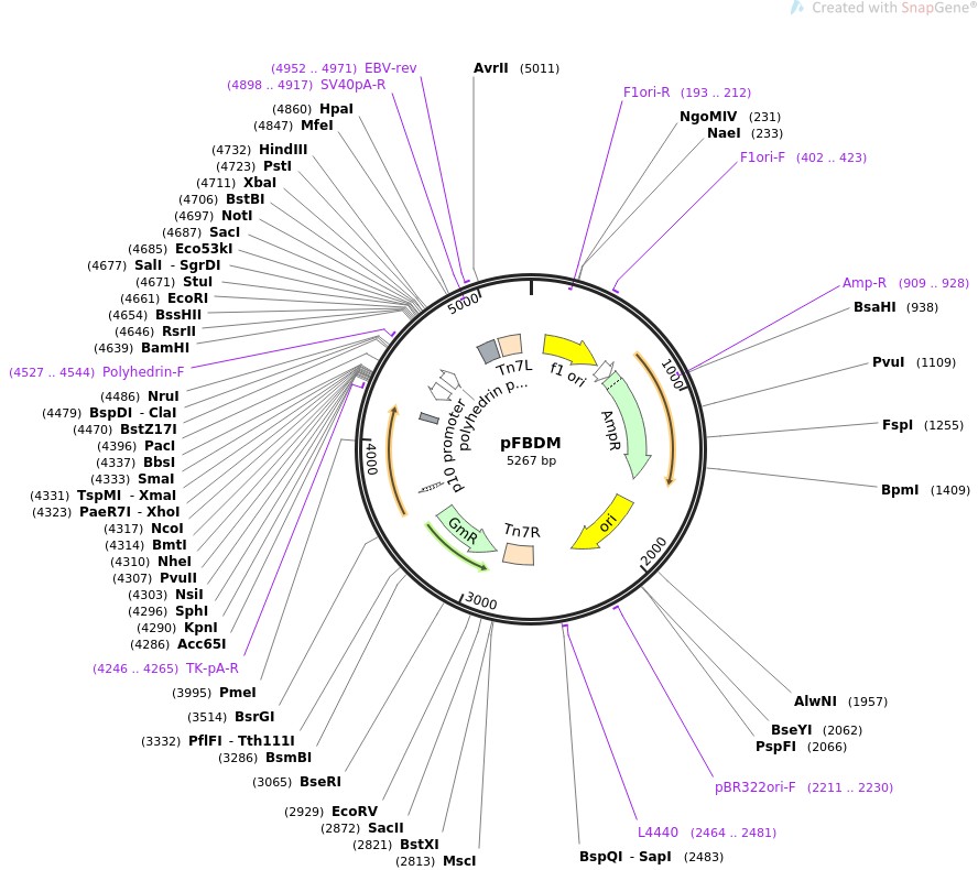 质粒名称:pFBDM 质粒编号:110738 质粒备注: (Empty Backbone) Plasmid for the insect cell expression system, two promoters, Multiplication Module M, Tn7 transposition 载体名称:pFBDM 载体大小:5279 载体类型:Insect Expression 筛选标记:Gentamicin 原核抗性:Ampicillin and Gentamicin, 100 & 10 μg/mL 培养温度:37℃ 克隆菌株:DH5alpha 高拷贝/低拷贝:高拷贝 启动子:Polyhedrin and p10 promoters 克隆方法:限制性内切酶 质粒图谱: