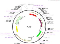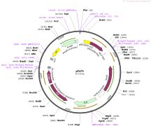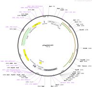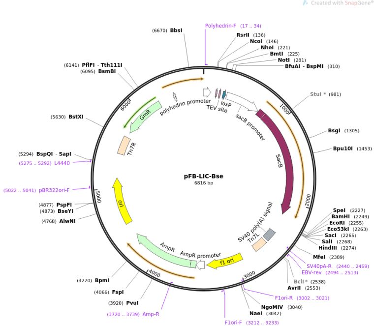 质粒名称:pFB-LIC-Bse 质粒编号:26108 质粒备注: (Empty Backbone) SGC Baculovirus transfer vector with His tag in 22-aa N-terminal fusion peptide with TEV protease cleavage site. Includes sites for LIC cloning, and SacB gene for negative selection 载体名称:pFastBac 载体大小:4803 载体类型:Insect Expression ; baculovirus expression 筛选标记:Gentamicin 原核抗性:氨苄青霉素,100μg/mL 培养温度:37℃ 克隆菌株:DH5alpha 高拷贝/低拷贝:高拷贝 插入基因:None 启动子:polyhedrin 克隆方法:Ligation Independent Cloning 5'测序引物:fBac-1 (5'-TATTCATACCGTCCCACCA-3') 3'测序引物:fBac-2 (5'-GGGAGGTTTTTTAAAGCAAGTAAA-3') 质粒图谱: