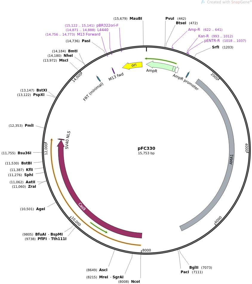 质粒名称:pFC330 质粒编号:87842 质粒备注: AMA1 plasmid with Aspergillus optimized Cas9 and pyrG selection marker 载体名称:custom 完整质粒大小:15764 载体类型:Bacterial Expression, CRISPR ; Fungal expression 筛选标记:pyrG 原核抗性:氨苄青霉素,100μg/mL 培养温度:37℃ 克隆菌株:DH5alpha 高拷贝/低拷贝:未知 插入基因:Cas9 物种来源:Synthetic; synthetic gene, codon optimized for A. niger 插入大小:4131 启动子:Aspergillus nidulans tef1 promoter 克隆方法:未知 5'测序引物:CTTCTCTGCTCAGCACCTCTACG 质粒图谱: