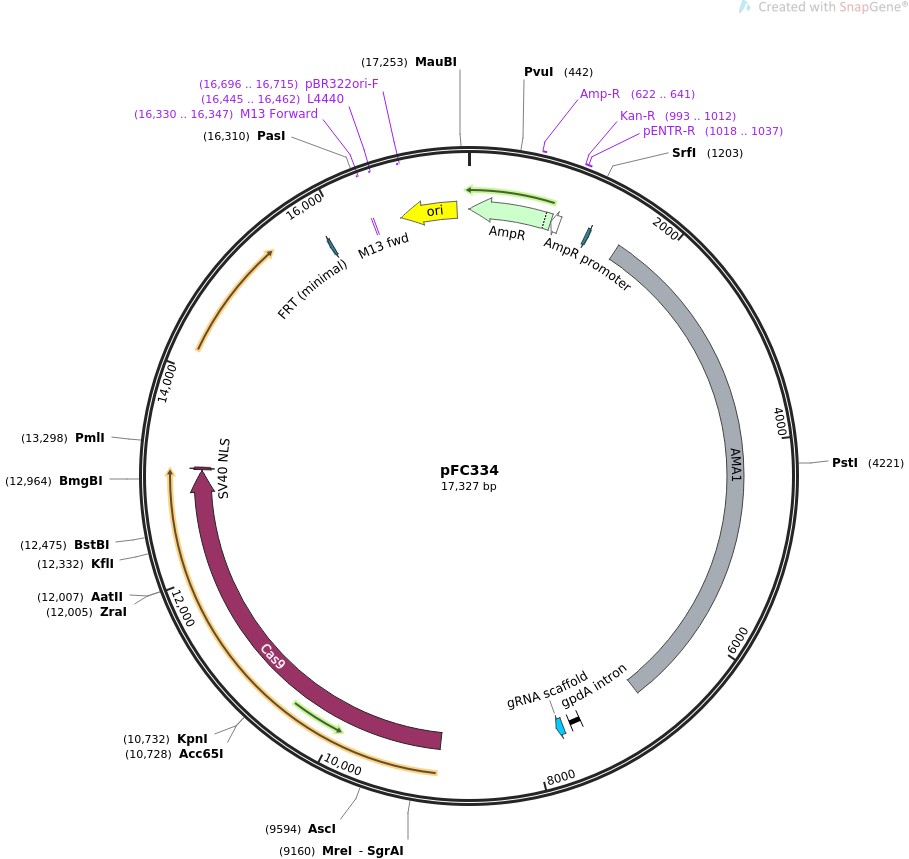 质粒名称:pFC334 质粒编号:87846 质粒备注: AMA1 plasmid with Aspergillus optimized Cas9, argB selection marker and yA specific sgRNA expressed with ribozymes 载体名称:pFC331 载体类型:Bacterial Expression, CRISPR ; Fungal expression 筛选标记:argB 原核抗性:氨苄青霉素,100μg/mL 培养温度:37℃ 克隆菌株:DH5alpha 高拷贝/低拷贝:未知 插入基因:Cas9 物种来源:Synthetic; synthetic gene, codon optimized for A. niger 插入大小:4131 启动子:Aspergillus nidulans tef1 promoter 克隆方法:未知 5'测序引物:CTTCTCTGCTCAGCACCTCTACG 质粒图谱: