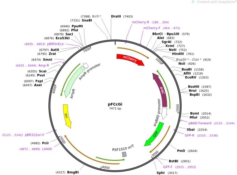 质粒名称:pFCcGi 质粒编号:59324 质粒备注: Inducible expression of GFP and constitutive expression of mCherry 载体名称:pFPV25.1 载体大小:4764 完整质粒大小:7200 载体类型:原核表达 原核抗性:氨苄青霉素,100μg/mL 培养温度:37℃ 克隆菌株:DH5alpha 高拷贝/低拷贝:未知 插入基因:mCherry 启动子:rpsM 克隆方法:未知 5'测序引物:mCherry-R 3'测序引物:PBAD-R 质粒图谱: