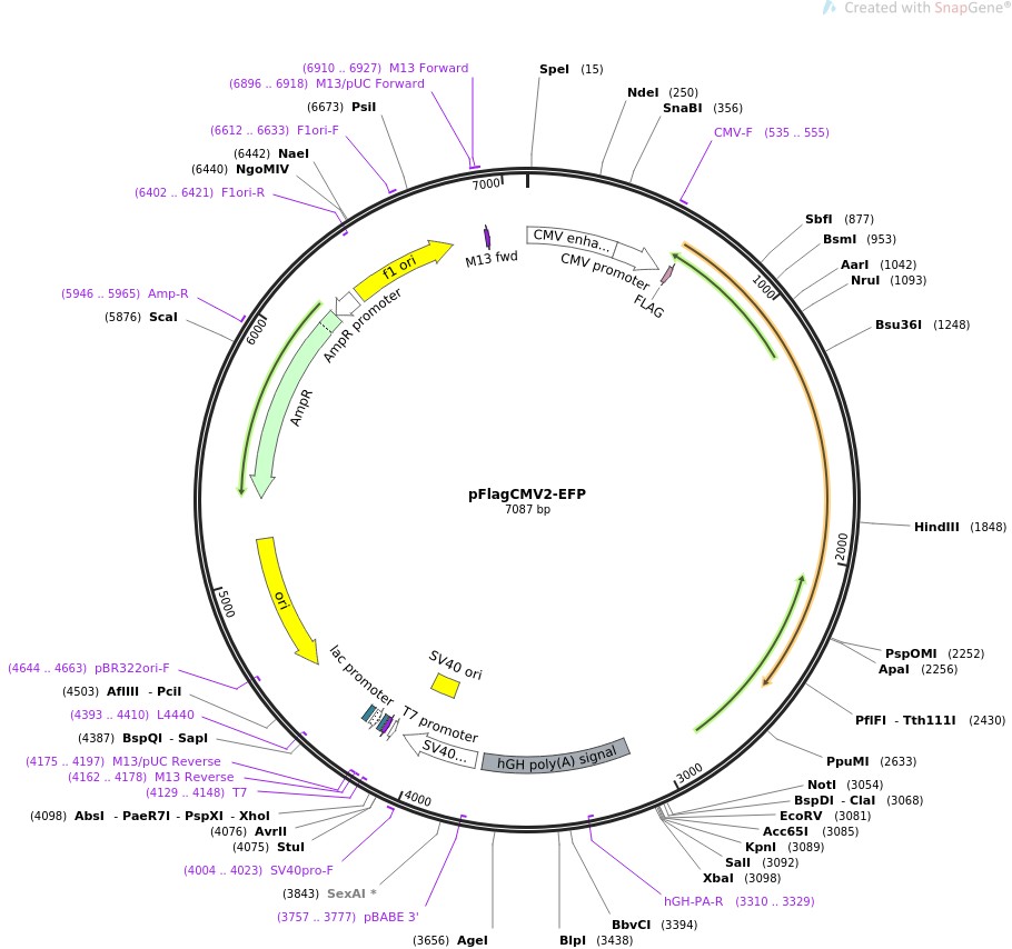 质粒名称:pFlagCMV2-EFP 质粒编号:12449 载体名称:pFlag-CMV2 载体大小:4679 载体类型:哺乳动物表达 原核抗性:氨苄青霉素,100μg/mL 培养温度:37℃ 克隆菌株:DH5alpha 高拷贝/低拷贝:高拷贝 插入基因:EFP 物种来源:H. sapiens (human) 基因名称:TRIM25 (a.k.a. EFP, RNF147, Z147, ZNF147) 启动子:CMV 克隆方法:限制性内切酶 5'克隆位点:HindIII (destroyed during cloning) 3'克隆位点:HindIII (destroyed during cloning) 5'测序引物:CMV-F 3'测序引物:hGH-pA-R (5'-CCAGCTTGGTTCCCAATAGA-3') 质粒图谱: