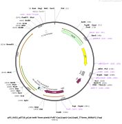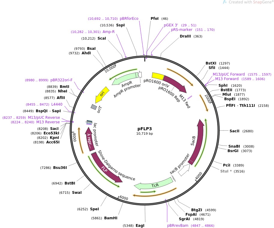 质粒名称:pFLP3 质粒编号:64946 质粒备注: Flp recombinase expression vector 载体名称:pFLP1 完整质粒大小:10925 载体类型:原核表达 原核抗性:Ampicillin and Tetracycline, 100 & 10 μg/mL 培养温度:37℃ 克隆菌株:DH5alpha 高拷贝/低拷贝:高拷贝 插入基因:Flp recombinase 质粒图谱: