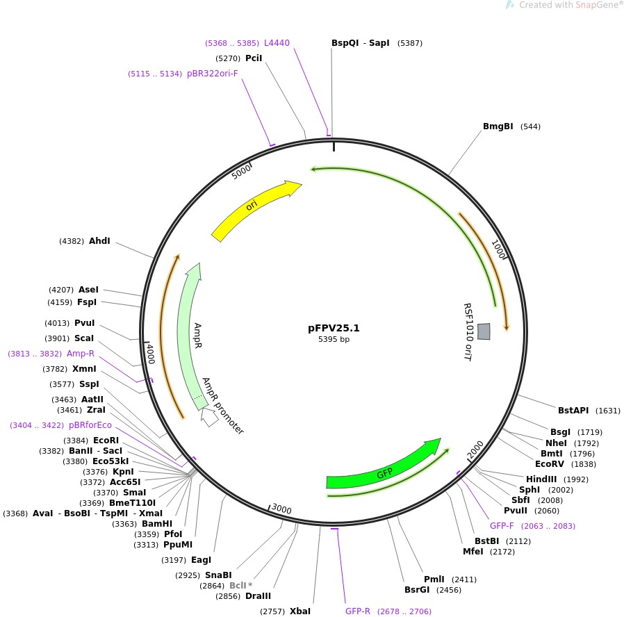 质粒名称:pFPV25.1 质粒编号:20668 质粒备注: (Empty Backbone) S. typhimurium rpsM promoter driving gfpmut3 expression in bacteria. Promoter is not regulated by acidic conditions. 载体名称:pFPV 载体大小:4764 载体类型:原核表达 原核抗性:氨苄青霉素,100μg/mL 培养温度:37℃ 克隆菌株:DH5alpha 高拷贝/低拷贝:未知 插入基因:None 克隆方法:限制性内切酶 5'克隆位点:EcoRI (not destroyed) 3'克隆位点:XbaI (not destroyed) 5'测序引物:n/a 质粒图谱: