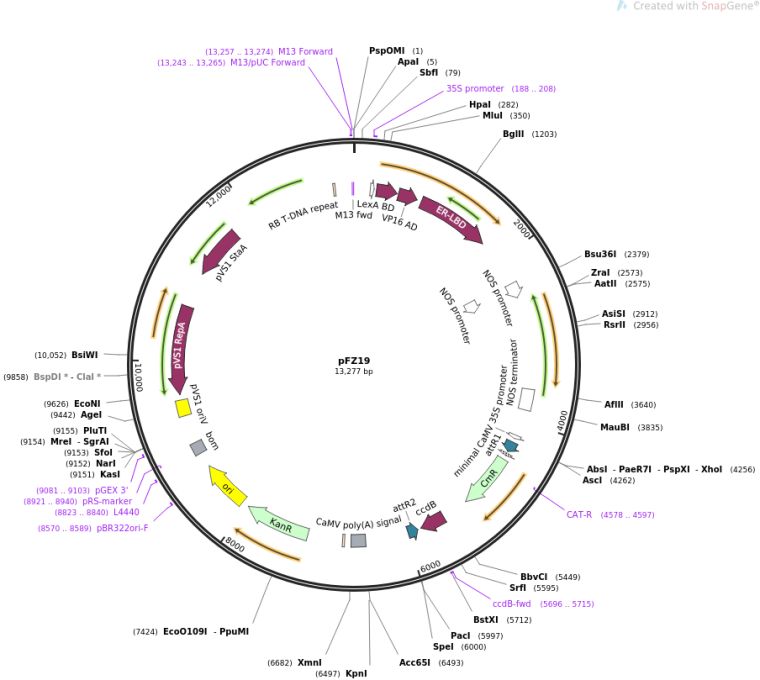 质粒名称:pFZ19 质粒编号:36184 质粒备注: (Empty Backbone) 载体名称:unknown 载体类型:Plant Expression ; plant T-DNA vector 筛选标记:潮霉素 原核抗性:Chloramphenicol and Kanamycin, 25 & 50 μg/mL 培养温度:37℃ 克隆菌株:DB3.1 高拷贝/低拷贝:高拷贝 启动子:XVE 克隆方法:未知 5'测序引物:catttggagaggacacgctggg 3'测序引物:gctaacatctctgggaattccgc 质粒图谱: