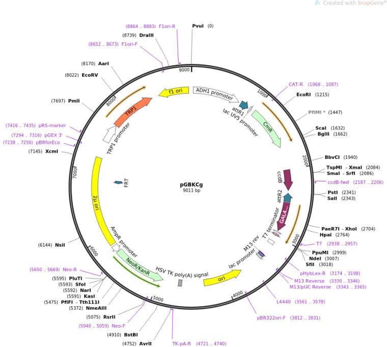 质粒名称:pGBKCg 质粒编号:20162 质粒备注: (Empty Backbone) 载体名称:pGBKT7 载体大小:9011 载体类型:酵母表达 筛选标记:TRP1 原核抗性:Chloramphenicol and Kanamycin, 25 & 50 μg/mL 培养温度:37℃ 克隆菌株:ccdB Survival 高拷贝/低拷贝:高拷贝 插入基因:None 克隆方法:限制性内切酶 5'测序引物:n/a 质粒图谱: