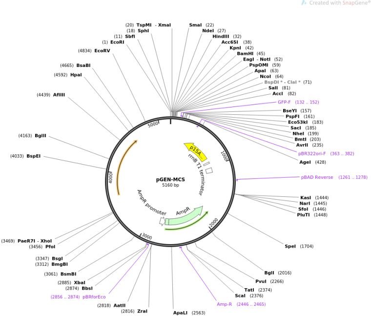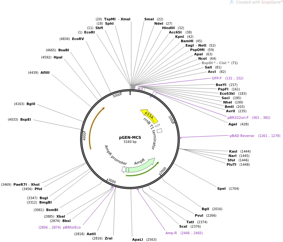 质粒名称:pGEN-MCS 质粒编号:44919 质粒备注: (Empty Backbone) 载体名称:pGEN 载体大小:5160 载体类型:stable complementation 原核抗性:氨苄青霉素,100μg/mL 培养温度:37℃ 克隆菌株:Top10 高拷贝/低拷贝:低拷贝 启动子:none 克隆方法:限制性内切酶 5'测序引物:GGCACTTGCTCACGCTCTG 3'测序引物:gtggtcacgcttttcgttgg 质粒图谱: