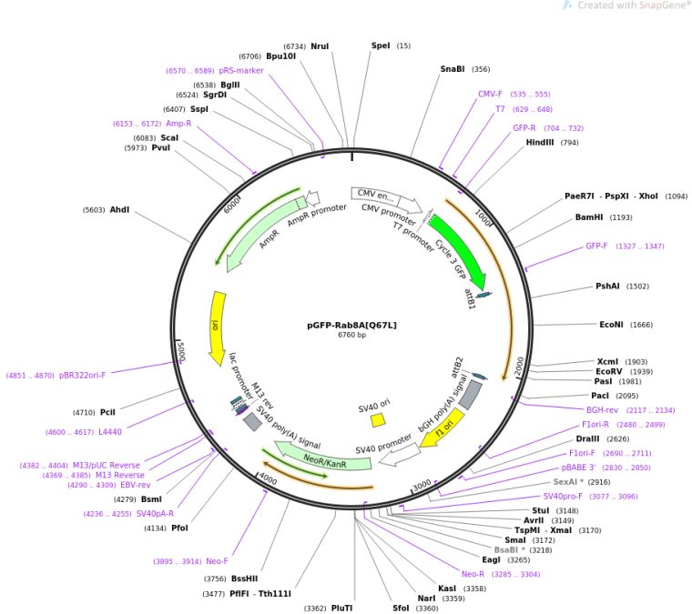 质粒名称:pGFP-Rab8A[Q67L] 质粒编号:24900 载体名称:pDEST53 载体大小:6100 载体类型:哺乳动物表达 原核抗性:氨苄青霉素,100μg/mL 培养温度:37℃ 克隆菌株:DH5alpha 高拷贝/低拷贝:高拷贝 插入基因:hRab8A[Q67L] 物种来源:H. sapiens (human) 基因突变:Changed Glutamine 67 to Leucine 插入大小:624 克隆方法:Gateway Cloning 5'克隆位点:Gateway recombination (not destroyed) 3'克隆位点:Gateway recombination (not destroyed) 5'测序引物:n/a 质粒图谱: