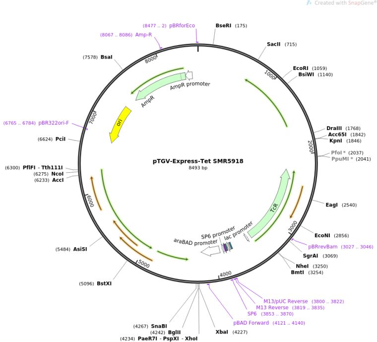 质粒名称:pTGV-Express-Tet SMR5918 质粒编号:28035 质粒备注: (Empty Backbone) 载体名称:n/a 载体大小:8493 载体类型:原核表达 原核抗性:Tetracycline, 10 μg/mL 培养温度:37℃ 克隆菌株:DH5alpha 高拷贝/低拷贝:未知 插入基因:None 克隆方法:限制性内切酶 5'测序引物:n/a 质粒图谱: