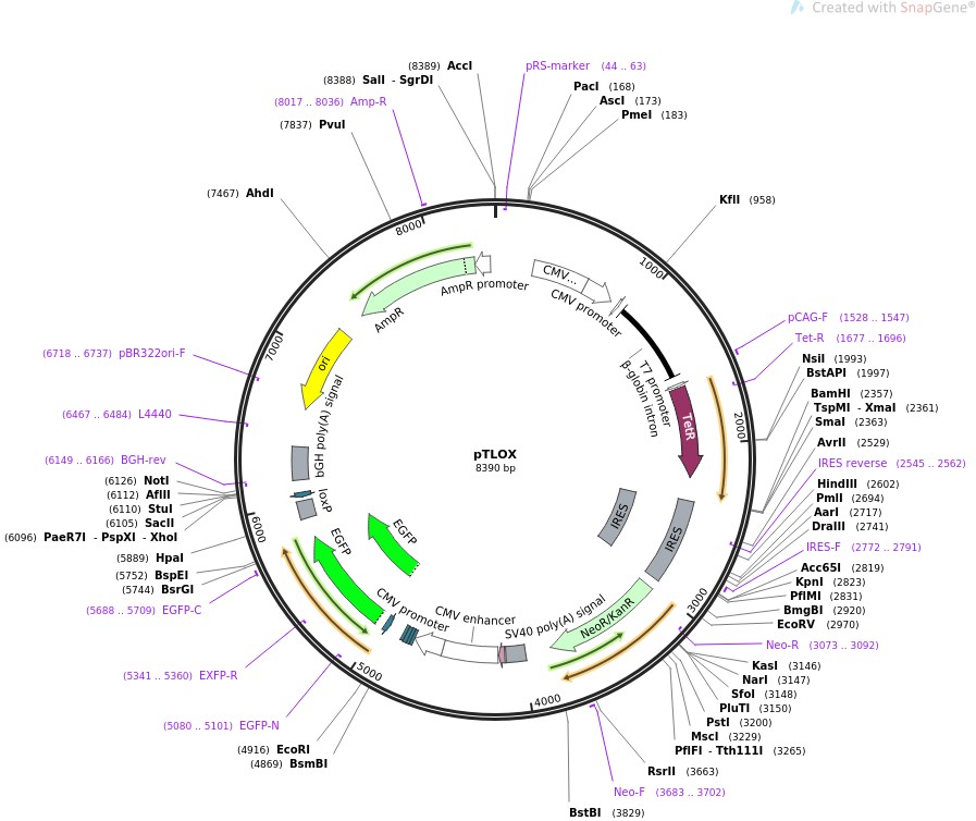质粒名称:pTLOX 质粒编号:12513 质粒备注: (Empty Backbone) 载体名称:na 载体大小:8390 载体类型:Mammalian Expression, Cre/Lox 筛选标记:新霉素(G418) 原核抗性:氨苄青霉素,100μg/mL 培养温度:37℃ 克隆菌株:DH5alpha 高拷贝/低拷贝:高拷贝 插入基因:None 克隆方法:限制性内切酶 5'克隆位点:See map (unknown if destroyed) 3'克隆位点:See map (unknown if destroyed) 5'测序引物:na 质粒图谱: