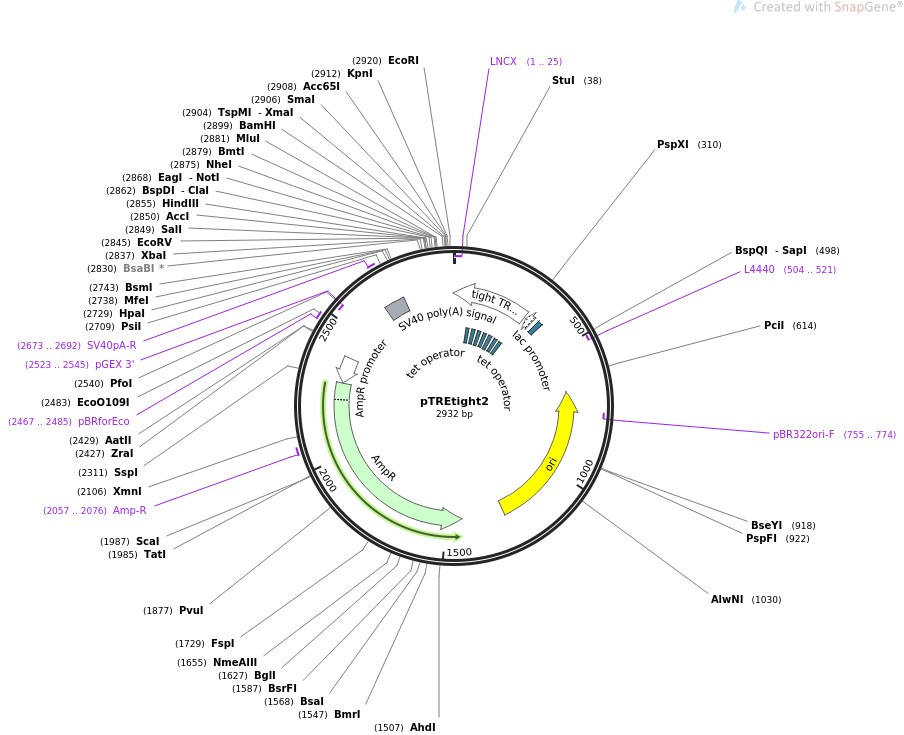 质粒名称:pTREtight2 质粒编号:19407 质粒备注: (Empty Backbone) 载体名称:pTREtight 载体大小:2932 载体类型:哺乳动物表达 原核抗性:氨苄青霉素,100μg/mL 培养温度:37℃ 克隆菌株:DH5alpha 高拷贝/低拷贝:高拷贝 插入基因:empty vector 克隆方法:限制性内切酶 5'测序引物:T7 3'测序引物:T7 Term 质粒图谱: