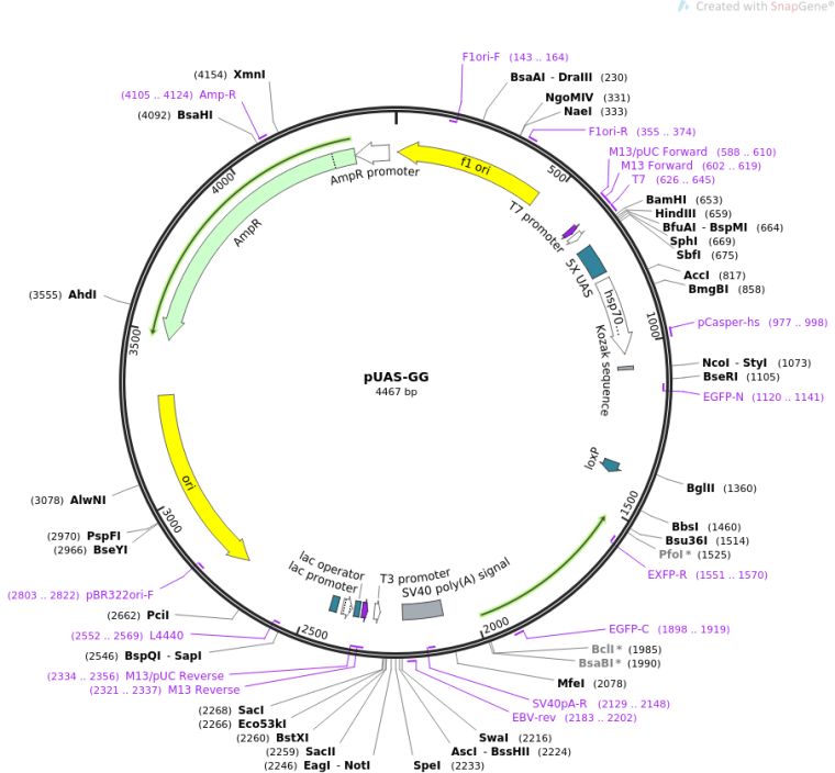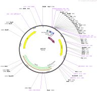 质粒名称:pUAS-GG 质粒编号:24342 质粒备注: (Empty Backbone) 载体名称:pBluescript SK(+) 载体大小:3000 载体类型:哺乳动物表达 原核抗性:氨苄青霉素,100μg/mL 培养温度:37℃ 克隆菌株:DH5alpha 高拷贝/低拷贝:高拷贝 插入基因:None 克隆方法:限制性内切酶 5'克隆位点:BamHI (not destroyed) 3'克隆位点:BglII (unknown if destroyed) 5'测序引物:GFP-N 质粒图谱: