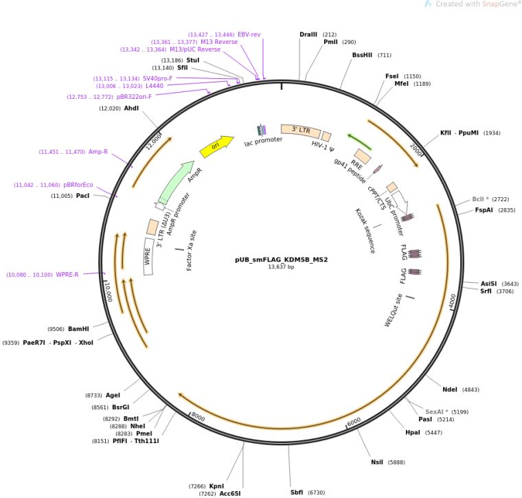 质粒名称:pUB_smFLAG_KDM5B_MS2 质粒编号:81084 质粒备注: Translation reporter: Encodes KDM5B (1544 aa) fused to smFLAG (Spaghetti Monster FLAG: 10 copies of an epitope tag FLAG). 载体名称:pHAGE-UbiC 完整质粒大小:13642 载体类型:哺乳动物表达 原核抗性:氨苄青霉素,100μg/mL 培养温度:37℃ 克隆菌株:NEB Stable 高拷贝/低拷贝:高拷贝 插入基因:smFLAG_KDM5B_24xMS2 质粒图谱: