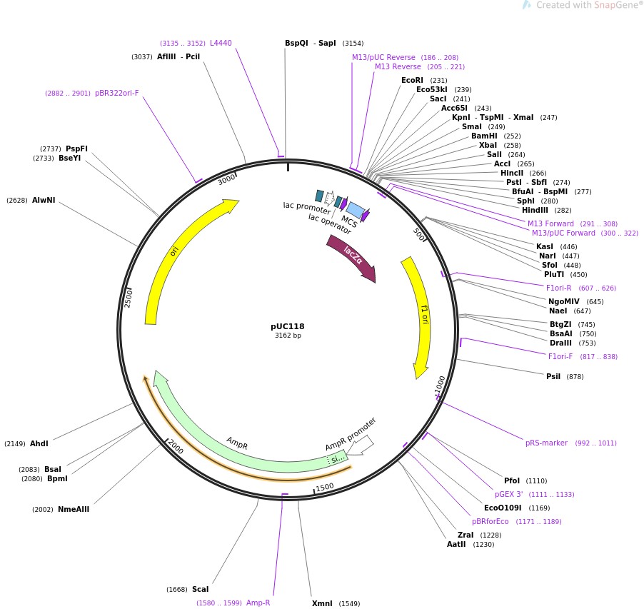 质粒名称:pUC118 质粒编号:50009 质粒备注: (Empty Backbone) pUC cloning vector 载体名称:pUC18 载体类型:cloning vector 原核抗性:氨苄青霉素,100μg/mL 培养温度:37℃ 克隆菌株:DH5alpha 高拷贝/低拷贝:高拷贝 克隆方法:限制性内切酶 5'测序引物:M13-F20 3'测序引物:M13R 质粒图谱: