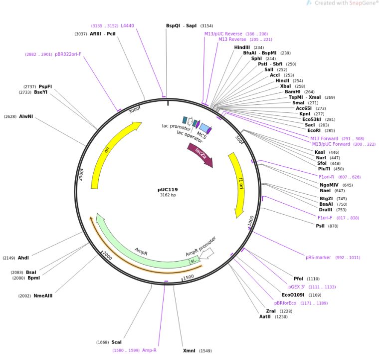 质粒名称:pUC119 质粒编号:50010 质粒备注: (Empty Backbone) pUC cloning vector 载体名称:pUC19 载体类型:cloning vector 原核抗性:氨苄青霉素,100μg/mL 培养温度:37℃ 克隆菌株:DH5alpha 高拷贝/低拷贝:高拷贝 克隆方法:限制性内切酶 5'测序引物:M13-F20 3'测序引物:M13R 质粒图谱: