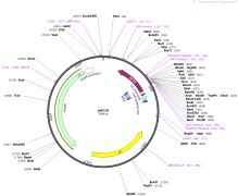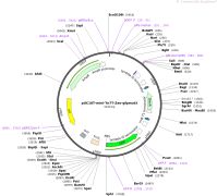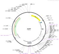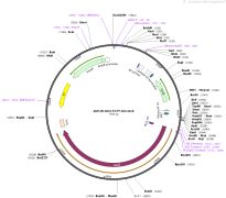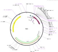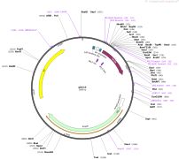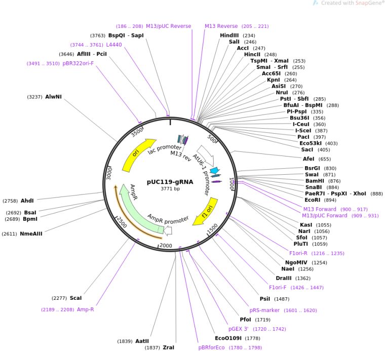 质粒名称:pUC119-gRNA 质粒编号:52255 质粒备注: Can use a PCR template to assemble new desired guide RNA. Contains an Arabidopsis U6 promoter to drive guide RNA (targeting AtPDS3 gene target site 1) expression with a TTTTTT as terminator. 载体名称:pUC119 载体大小:3162 载体类型:CRISPR ; Plant expression 原核抗性:氨苄青霉素,100μg/mL 培养温度:37℃ 克隆菌株:DH5alpha 高拷贝/低拷贝:未知 插入基因:guide RNA targeting AtPDS3 基因别名:PDS3 基因别名:phytoene desaturase 3 物种来源:A. thaliana (mustard weed) 基因名称:PDS3 (a.k.a. AT4G14210, DL3145C, FCAALL.28, PDE226, PDS, PHYTOENE DESATURASE, PIGMENT DEFECTIVE 226, phytoene desaturase 3) 启动子:Arabidopsis U6 polymerase III promoter 克隆方法:限制性内切酶 5'克隆位点:SacI (not destroyed) 3'克隆位点:SmaI (destroyed during cloning) 5'测序引物:5’ TGGAATTGTGAGCGGATA 3’ 3'测序引物:5’ ATTAAGTTGGGTAACGCC 3' 质粒图谱: