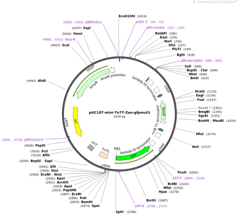 pUC18T-mini-Tn7T-Zeo-gfpmut3