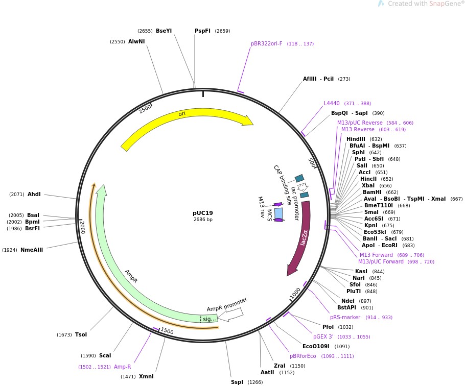 质粒名称:pUC19 质粒编号:50005 质粒备注: (Empty Backbone) pUC cloning vector 载体名称:pUC6, Addgene plasmid #49793 载体大小:2686 载体类型:cloning vector 原核抗性:氨苄青霉素,100μg/mL 培养温度:37℃ 克隆菌株:DH5alpha 高拷贝/低拷贝:高拷贝 启动子:lac 克隆方法:限制性内切酶 5'测序引物:M13-F20 3'测序引物:M13R 质粒图谱: