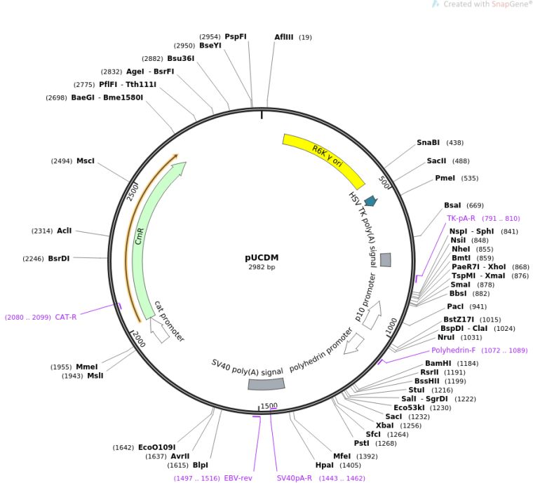 质粒名称:pUCDM 质粒编号:110742 质粒备注: (Empty Backbone) Plasmid for the insect cell expression system, donor for plasmid fusions, two promoters, Multiplication Module M, LoxP site 载体名称:pUCDM 载体大小:2979 载体类型:Insect Expression 筛选标记:Chloramphenicol 原核抗性:氯霉素25μg/mL 培养温度:37℃ 克隆菌株:Pir1 高拷贝/低拷贝:低拷贝 启动子:Polyhedrin and p10 promoters 克隆方法:限制性内切酶 质粒图谱: