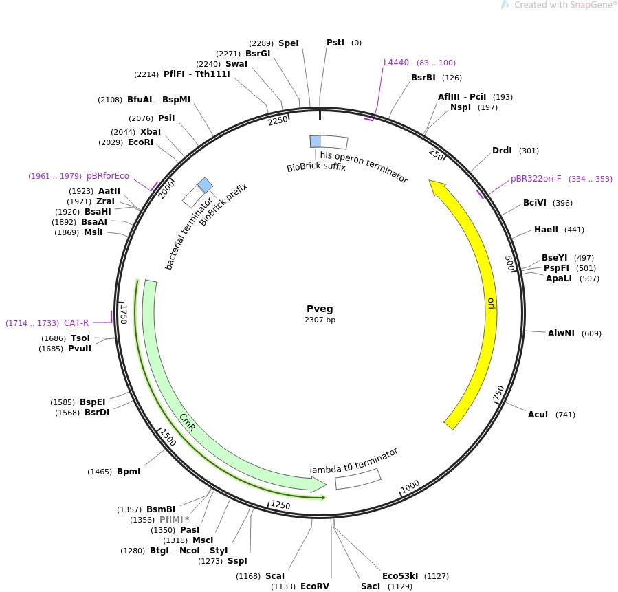 质粒名称:Pveg 质粒编号:55173 质粒备注: Very strong constitutive promoter 载体名称:pSB1C3 载体大小:2070 完整质粒大小:2307 载体类型:Synthetic Biology ; Bacillus BioBrick Box 原核抗性:氯霉素25μg/mL 培养温度:37℃ 克隆菌株:DH5alpha 高拷贝/低拷贝:高拷贝 插入基因:veg promoter 基因别名:Pveg 物种来源:B. subtilis 插入大小:237 启动子:veg 克隆方法:限制性内切酶 5'克隆位点:EcoRI (not destroyed) 3'克隆位点:PstI (not destroyed) 5'测序引物:na 质粒图谱: