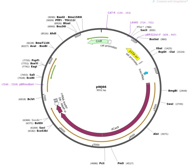 质粒名称:pWJ66 质粒编号:46570 质粒备注: Same as pdCas9, but with the dCas9-w fusion (w is fused at the C-terminal end of dCas9) 载体名称:pACYC184 载体类型:Bacterial Expression, CRISPR 原核抗性:氯霉素25μg/mL 培养温度:37℃ 克隆菌株:DH5alpha 高拷贝/低拷贝:低拷贝 插入基因:tracrRNA 物种来源:S. pyogenes 质粒图谱: