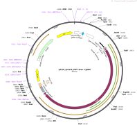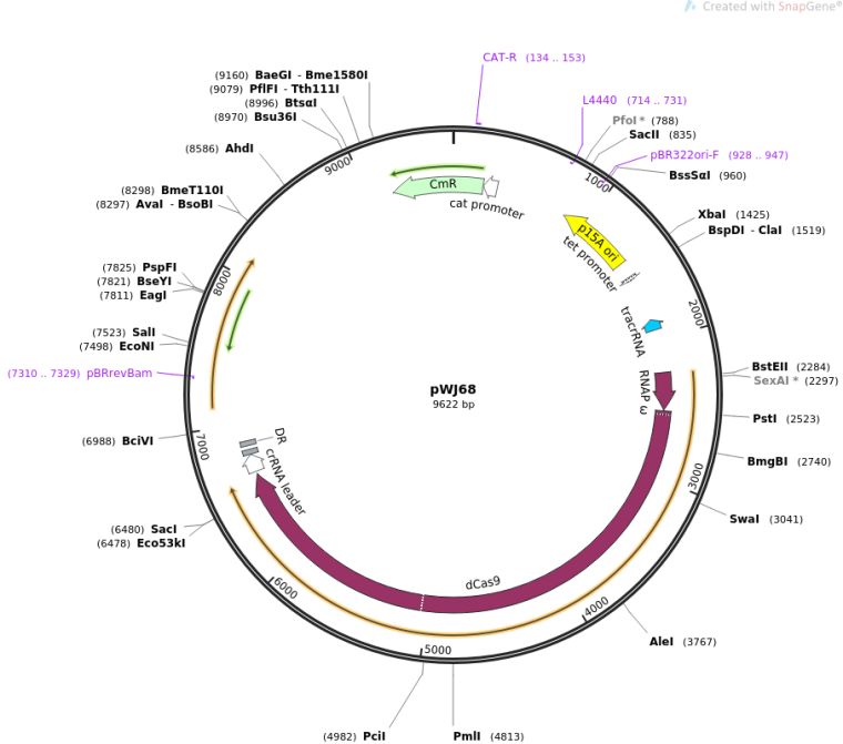 质粒名称:pWJ68 质粒编号:46571 质粒备注: Same as pdCas9, but with the w-dCas9 fusion (w is fused at the N-terminal end of dCas9) 载体名称:pACYC184 载体类型:Bacterial Expression, CRISPR 原核抗性:氯霉素25μg/mL 培养温度:37℃ 克隆菌株:DH5alpha 高拷贝/低拷贝:低拷贝 插入基因:tracrRNA 物种来源:S. pyogenes 质粒图谱: